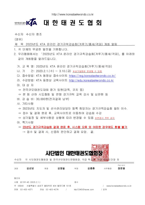 2023년도 KTA 온라인 경기규칙강습회(겨루기/품새/격파) 개최 알림 작성자전북태권도협회|작성시간23.02.02|조회수394 목록 댓글 0 글자크기 작게가 글자크기 크게가 다음검색 현재 게시글 추가 기능 열기 북마크 신고 센터로 신고 댓글 댓글 0 댓글쓰기 답글쓰기 댓글 리스트