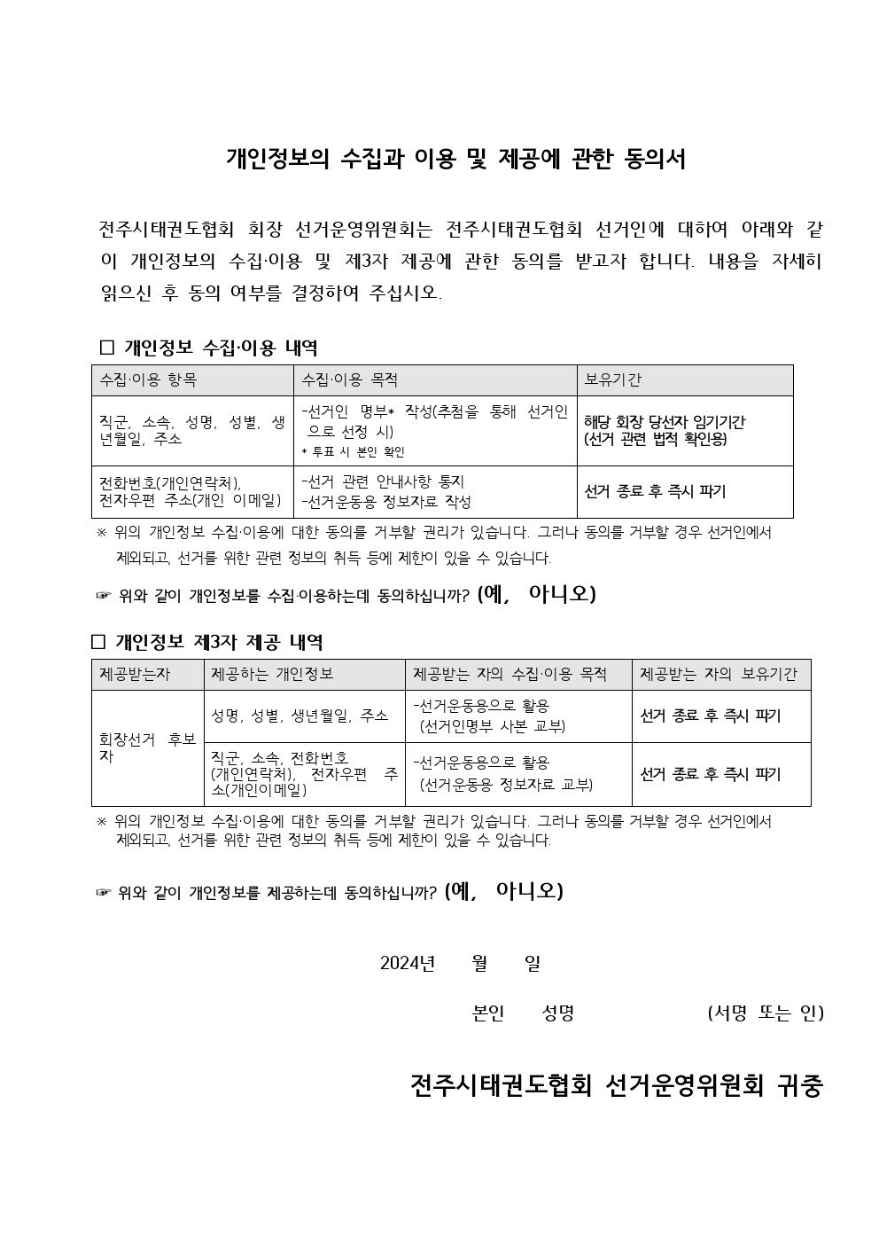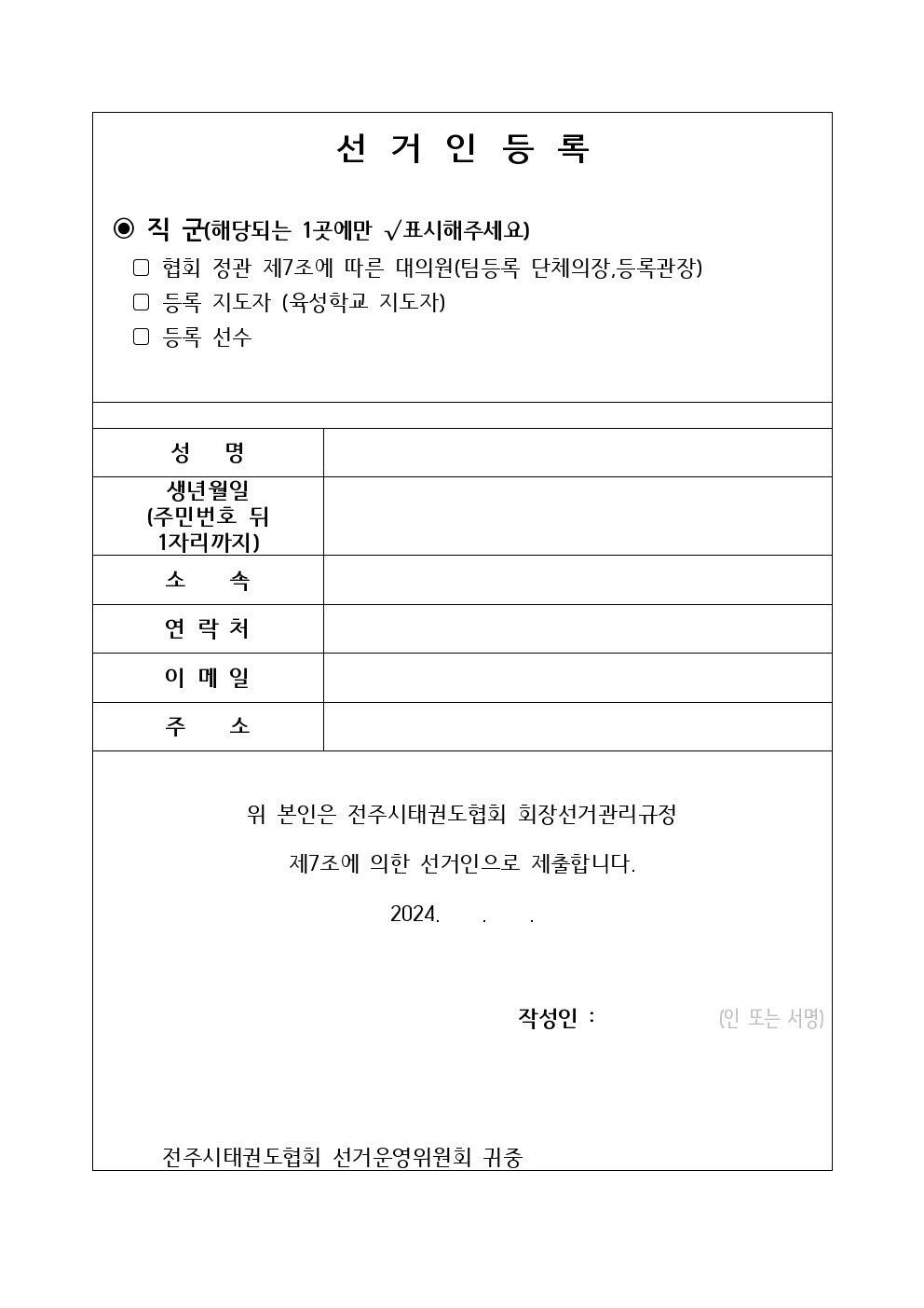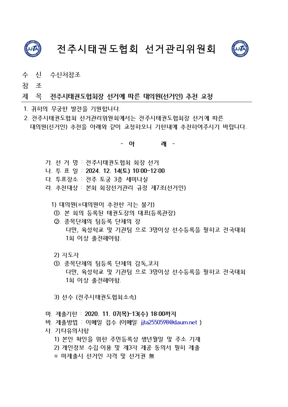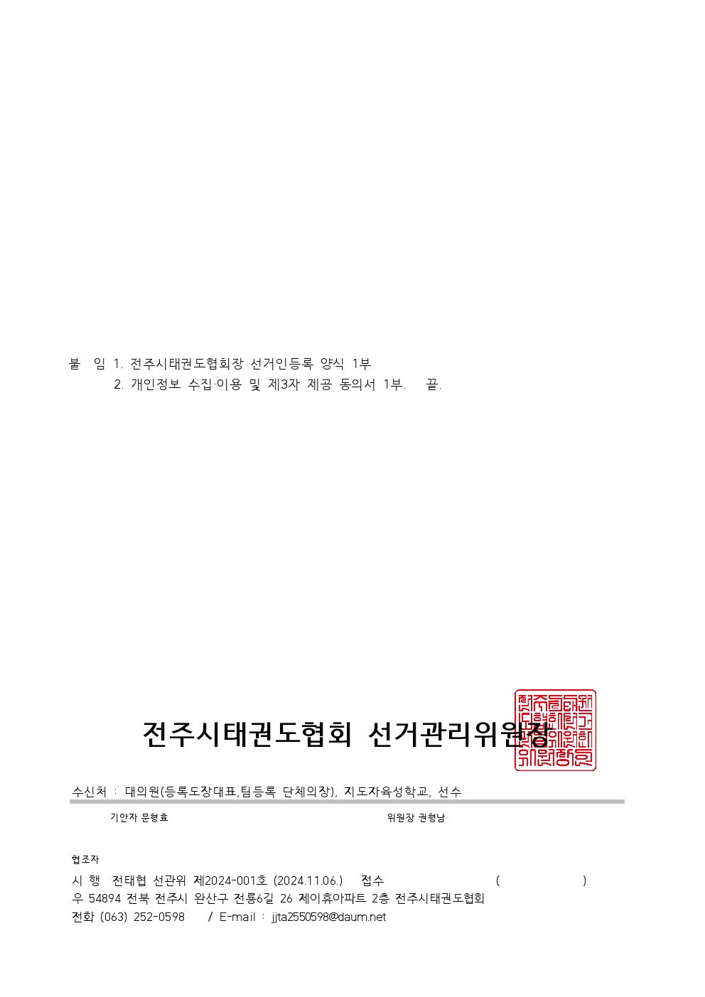 전주시 태권도협회 회장선거 작성자전주시태권도협회|작성시간24.11.07|조회수96 목록 댓글 0 글자크기 작게가 글자크기 크게가 선거인등록 양식.hwp9.00KB선거인 개인정보동의서 양식.hwp8.00KB 첨부파일첨부된 파일이 6개 있습니다. jpg 파일 1730950192214-0.jpg 다운로드 jpg 파일 1730950192214-1.jpg 다운로드 jpg 파일 1730950197059-0.jpg 다운로드 jpg 파일 1730950197059-1.jpg 다운로드 hwp 파일 선거인등록 양식.hwp 다운로드 hwp 파일 선거인 개인정보동의서 양식.hwp 다운로드 다음검색 현재 게시글 추가 기능 열기 북마크 공유하기 신고 센터로 신고 댓글 댓글 0 댓글쓰기 답글쓰기 댓글 리스트
