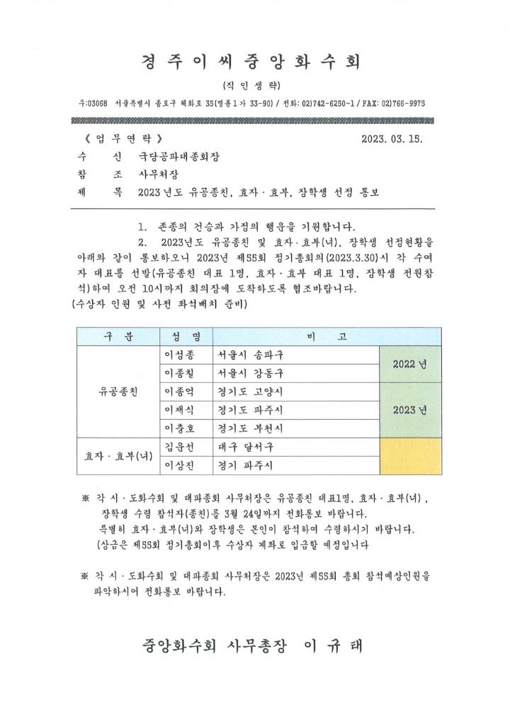 < 경주이씨중앙화수회 제55회 정기총회 개최 안내>