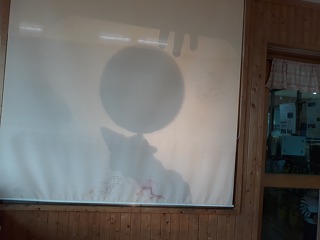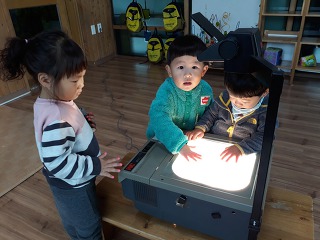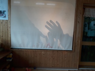 환하게 비치는 ohp를 탐색하여 봅니다. 손을 올려 놓으니 손그림자가 나타납니다.
