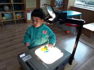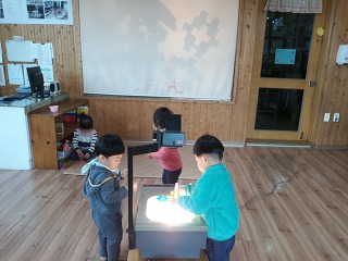 아이들은 블럭을 만들어 와서 ohp에 올려 보며 그림자를 만들어 갑니다.