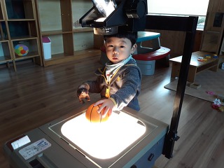 자동차도 올려 보고 놀잇감들을 하나 씩 들고 와서 ohp위에 올려 봅니다.