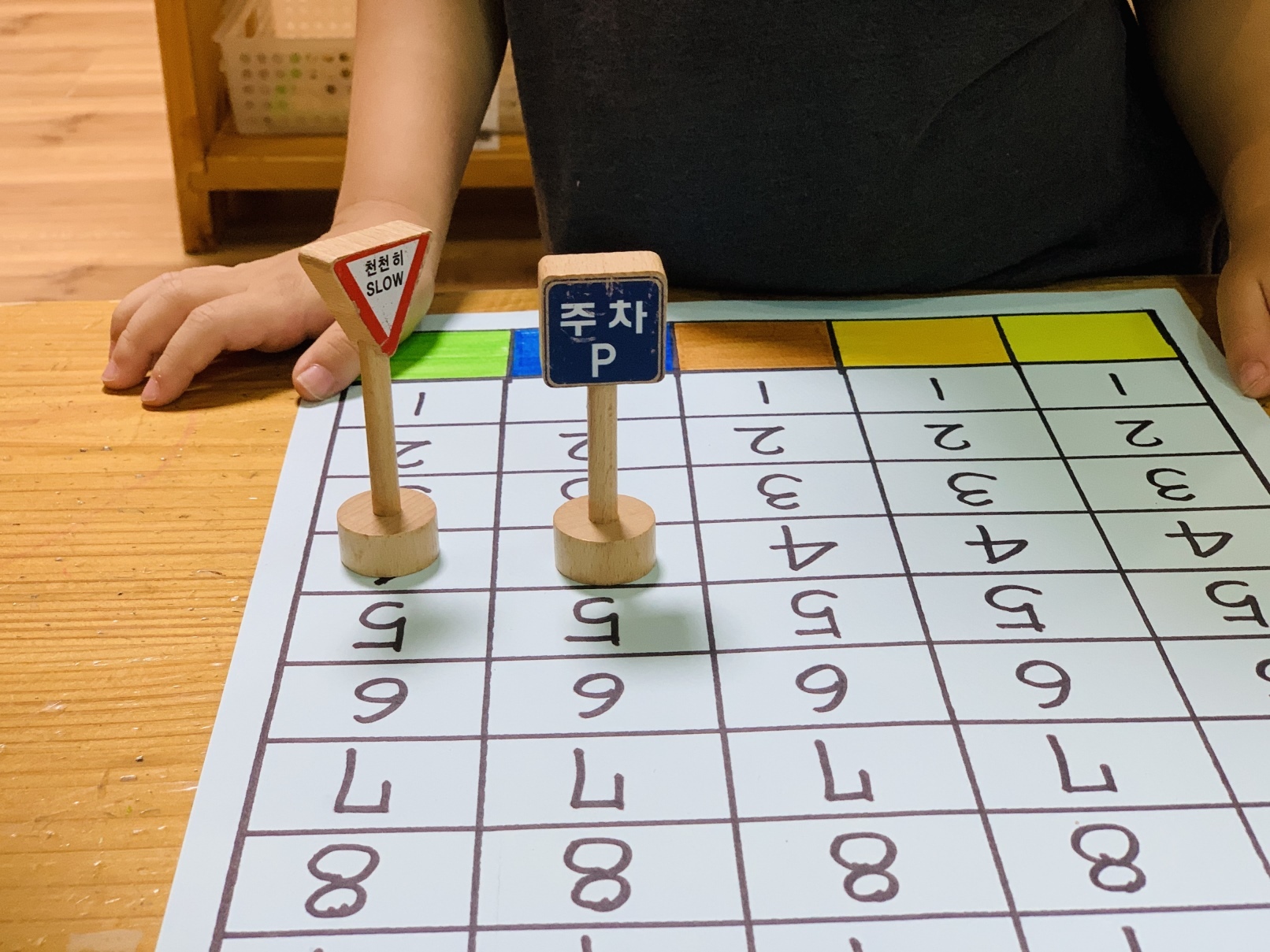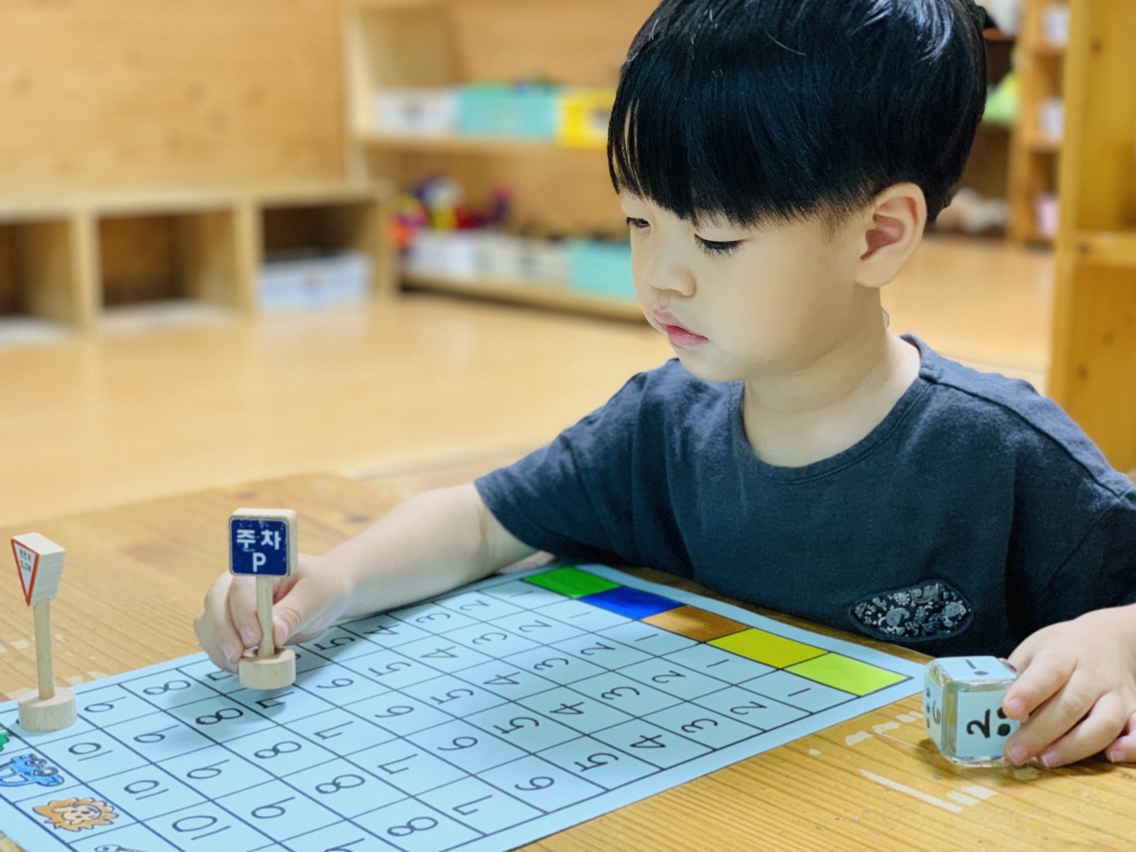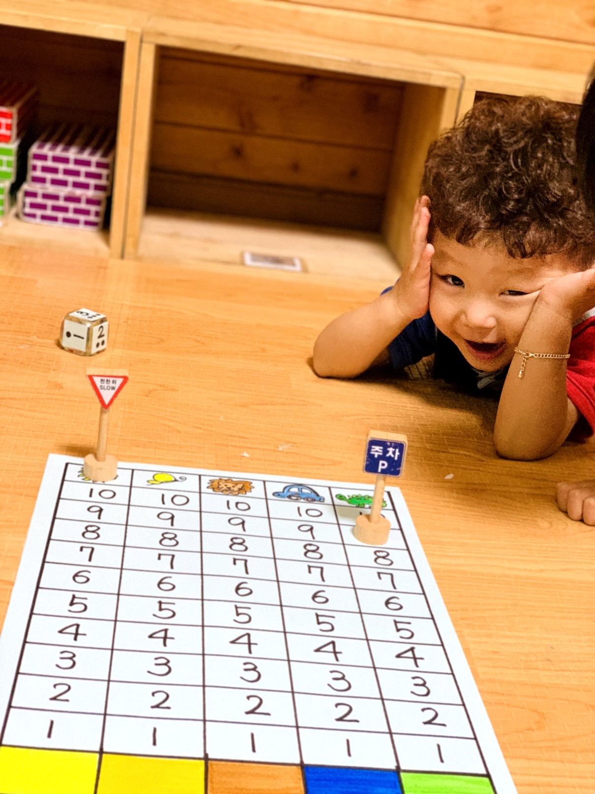 그리고 주사위를 던져 나온 숫자만큼 깃발을 이동시키는 모습에서 '한 칸' '두 칸'의 의미를 이해해가고 있음을 발견합니다.