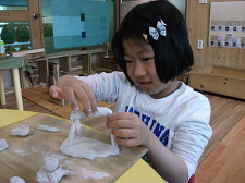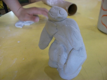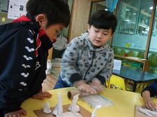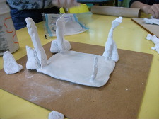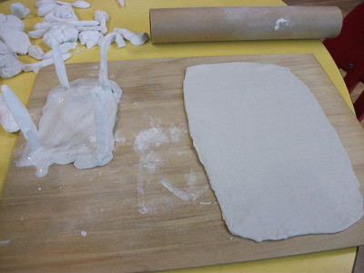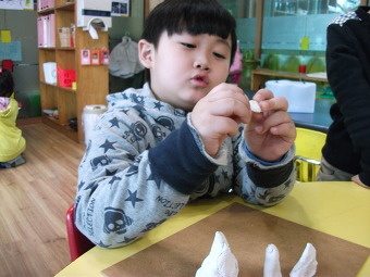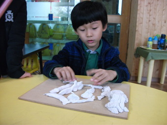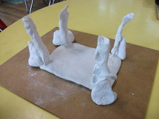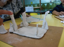 성질이 무른 지점토를 세우기란 여간 힘든 일입니다. 어제의 경험을 배경으로 오늘은 지점토의 지지대가 될만한 몇몇의 기둥을 가지고 어린이들과 만났습니다.