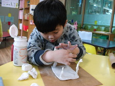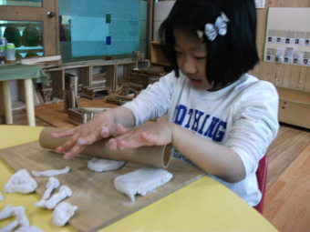 지난시간 작품들이 딱딱하게 굳어 어린이들이 원하던 바르게 세워진 기둥과 비슷한 모습을 하고 있습니다. 지지대로 사용하려던 원통기둥은 어린이들에게는 밀대가 됩니다. 아마 규헌이는 사각기둥을 만들어 건조한 후 딱딱하게 굳은 지점토 기둥으로 사용하려 하는 것 같습니다. 종윤이는 먼저 만들어진 작품에서 긴 막대모양의 점토를 골라 바로 활동을 이어갑니다.