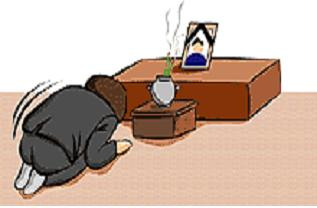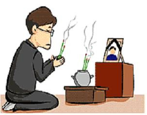 ①외투는 대문 밖에서 벗어 든다. ②상제에게 목례 ③영정 앞에 무릎꿇고 분향한다 (향을 한개나 세개를 집어 성냥불이나 촛불에 붙인 다음 손가락으로 가만히 잡아서 끄던가 왼손을 가볍게 흔들어 끈 다음 두손으로 향로에 꽂는다-절대로 입으로 끄지 말 것). | ||