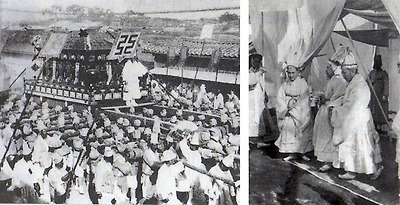 | 태상왕(비), 세자(빈), 세손(빈)이 사망하면 그 장례를 국상(國喪)으로 치렀다. 그렇지만 국상(國喪)에 대한 표현은 대상자에 따라 다른데, 국왕과 왕비의 장례는 국장(國葬)이라 일컬었고, 세자와 세자빈의 장례는 예장(禮葬), 황제의 장례는 어장(御葬)이라 했다. 당연히 사망을 표현하는 말도 대상자에 따라 달랐는데, 『예기』에 보면 천자는 붕(崩), 제후는 훙薨), 대부는 졸(卒), 사는 불록(不祿), 서민은 사(死) 라고 규정했다. 조선의 국왕은 제후국에 해당하므로 '훙'이란 표현을 사용하게 되는데, 『조선왕조실록』에는 통상 "상(上)이 승하(昇遐)했다"고 표현되어 있다. < 고종황제의 국장행렬(좌)-종로를 통과하고 있는 있는 대여(大轝)의 모습,고종황제의 국장 행렬에서의 순종(우) > | ||||