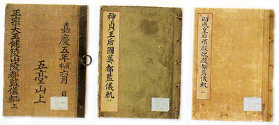 이제 발인(發靷)이 시작되어 국왕의 관이 궁궐을 떠나고 노제(路祭)를 거쳐 장지에 이른다. 산릉도감이 미리 만들어 놓은 장지에 도착하면 관을 정자각(丁字閣)에 모시고, 찬궁에서 관을 꺼내어 하관한다. 국장에서의 하관은 사전에 설치해 둔 녹로(轆轤) 등의 기계를 이용하였다. 왕릉 조성이 끝나면 우제(虞祭: 시신을 매장한 후 혼을 위로하는 제사)를 지내고, 가신주를 모시고 궁궐로 돌아와 혼전에 두었다. < 정종대왕(정조)건릉산릉도감의궤(좌),신정왕후국장도감의궤(중), 명성황후빈전도감의궤(우) > | ||||
