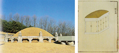 오늘날의 장례 풍습으로 말하면 장례를 총괄하는 집행부는 국장도감이, 빈소를 차리고 조문객을 맞는 일은 빈전도감이, 장지에서 묘를 만드는 일은 산릉도감이 담당했다고 보면 된다. 또한 빈전도감과는 별도로 혼전도감(魂殿都監)이 설치되었는데, 이곳은 장례를 치른 후 가신주(假神主: 뽕나무로 만든 가신주를 만들어 혼전에 모시고 삼년상을 치르는 혼전(魂殿: 사망한 국왕이나 왕비의 신주를 모셔 놓는 곳)에 관한 업무를 담당하는 곳이었다. 그런나 대부분은 빈전도감이 혼전에 관한 업무까지 함께 담당하였다. 국장의 절차는 국장도감 설치 → 빈전 마련 → 성복(成服: 상주들이 상복을 입음) → 발인(發靷) → 하관(下棺) → 반우(返虞 : 신주를 궁궐로 가져옴) → 국장도감 해산 의 순서로 진행된다. 이 순서에 따라 조선시대 국왕의 국장 절차를 살펴보자 국왕의 병이 깊어 죽음에 임박하면 유언을 듣게 되는데, 이를 고명(顧命)이라고 한다. 대개 국왕의 신임을 받던 측근 신하가 고명을 받으며, 그는 왕위를 전한다는 유교(遺敎)를 작성한다. 국왕이 사망하면 머리를 동쪽을 향하도록 눕히고, 내시가 국왕이 평소에 입던 옷을 가지고 궁궐 지붕에 올라가 용마루를 밝고 세 번 "상위복(上位復)" 이라 외친다. 이는 떠나가는 국왕의 혼령에게 돌아오라고 부르는 것이다. 국왕이 사망하면 왕세자 이하 신료들은 머리에 썼던 관과 입었던 옷을 벗고 머리를 푼다. 그리고 흰색의 옷과 신발, 버선을 착용하며, 3일 동안 아무것도 먹지 않는다. 또한 졸곡(卒哭) 때까지 궁중의 모든 제사와 음악 연주가 중지되며, 이후 삼년상이 끝날 때 까지 사직 제사만 올리고. 음악은 대사(大祀) 때에만 연주한다. 또한 민간에서도 국왕의 사망을 애도하기 위해 5일 동안 시장이 열리지 않으며, 결혼과 도살이 금지된다. 그 다음 국왕의 시신을 목욕시키고 의복을 갈아입히는 습(襲), 옷과 이불로 시체를 감싸는 소렴(小殮)과 대렴(大殮)이 진행됩니다. 대렴이 끝나면 시신을 넣은 재궁(梓宮: 가래나무로 만든 국왕의 관)을 빈전에 모신다. 일반인의 상례 때에는 빈소에 관을 그대로 두지만, 국장에서는 찬궁(攢宮)이라는 큰 상자를 만 들어 그곳에 재궁을 모셨다. 한편 국왕이 사망한 지 3일째에는 대신을 보내 사직과 종묘에 국왕의 사망을 알린다. 성복은 대렴을 한 다음날 거행하며, 새 국왕의 즉위식은 성복이 끝난 후에 치르게 되는데, 세 국왕은 전 국왕의 장례 절차가 한창 진행되는 도중에 간략한 의식을 거쳐서 왕위에 올랐다. 즉위식이 있는 날, 새 국왕은 즉위 교서를 반포한다. 그 내용은 대체로 선왕의 공적을 찬양하고 부족한 자신이 이를 계승하여 국왕이 되었음을 천명하는 것이었다. < 건릉 전경(좌) - 정조의 능인 건릉은 정조의 부친인 추존 장조의 융릉과 같은 영내에 있다. 찬궁도(우) > | ||||