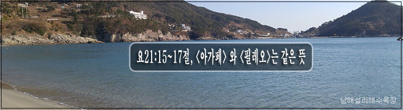 요21:15~17절, '아가페(AGAPE)'와 '필레오(PHILEO)'는 같은 뜻의 다른 단어일 뿐이다. 작성자말씀지킴이|작성시간17.12.13|조회수6,134 목록 댓글 0 글자크기 작게가 글자크기 크게가