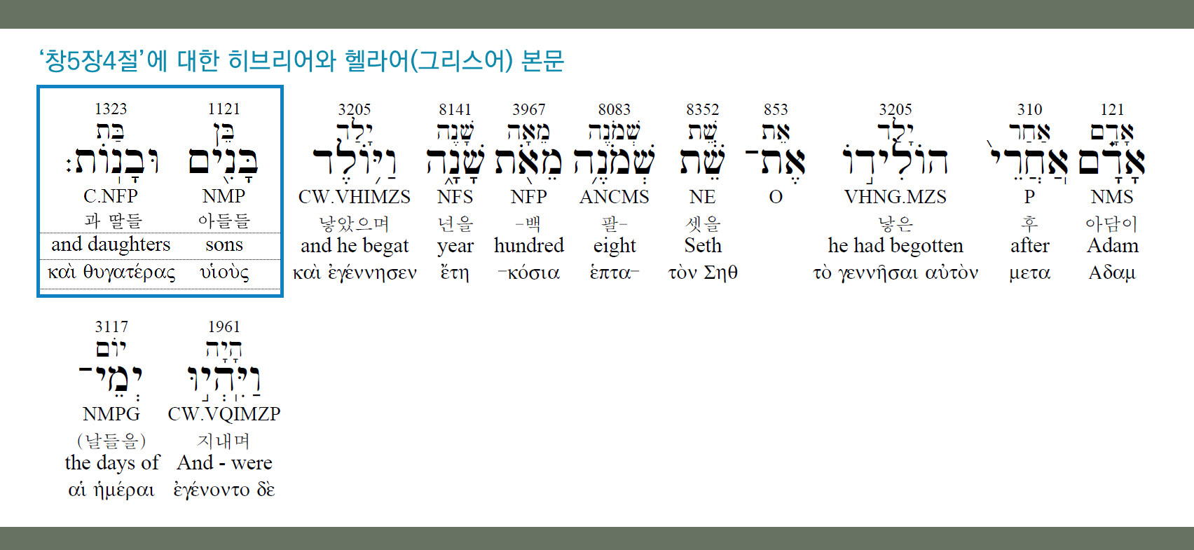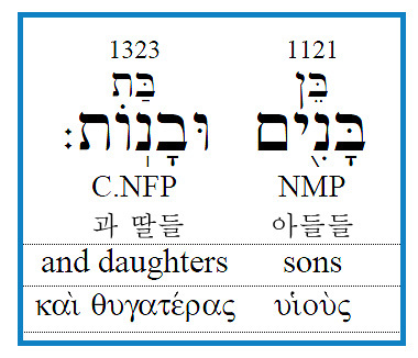 엄밀히 이 표현('아들딸들을 낳았더라')은 이상의 설명대로 살펴보건대, 창5장4절의 sons and daughters에 대한 역시 정확한 번역인 <아들들과 딸들>과는 다른 의미의 번역입니다.