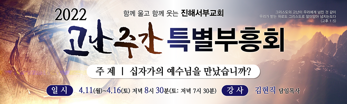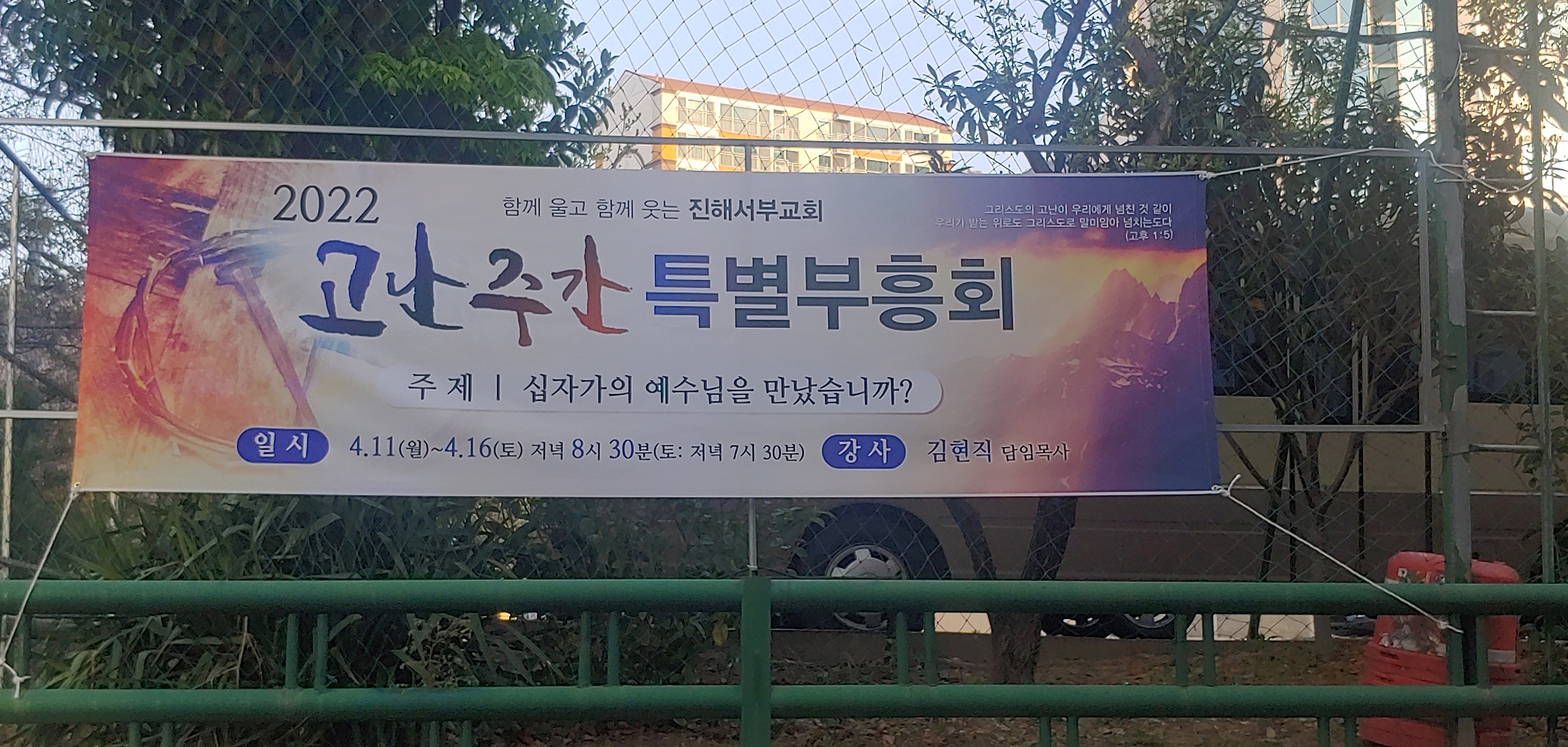 (부흥회)고난주간특별부흥회_2022.4.11~16 작성자정성진|작성시간22.04.10|조회수205 목록 댓글 0 글자크기 작게가 글자크기 크게가 첫째날 저녁집회 모습 다음검색 현재 게시글 추가 기능 열기 북마크 공유하기 신고 센터로 신고 댓글 댓글 0 댓글쓰기 댓글 리스트