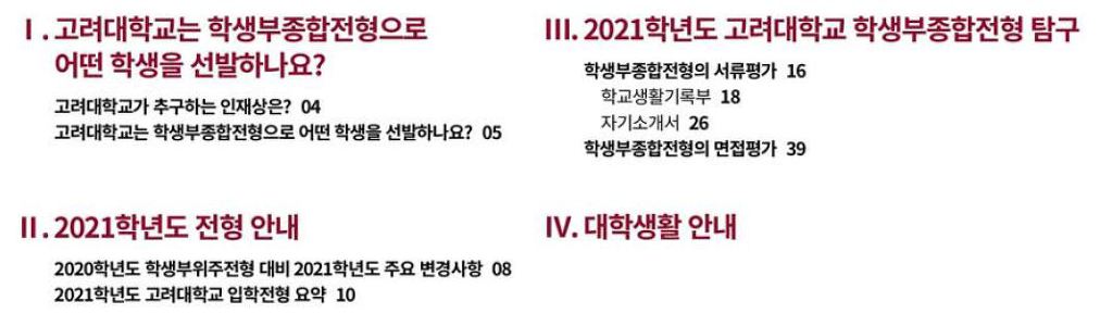 [고려대] 2021학년도 학생부종합전형 가이드북 작성자진로진학디자이너|작성시간20.04.08|조회수240 목록 댓글 0 글자크기 작게가 글자크기 크게가 [고려대] 2021학년도 학생부종합전형 가이드북2021학년도 수시 학생부종합전형 가이드북을 통해 인재상, 평가방법 등을 참고하세요.※ 파일첨부 2021 고려대 학생부종합전형 가이드북.pdf 첨부파일첨부된 파일이 3개 있습니다. jpg 파일 01.jpg 다운로드 jpg 파일 01.jpg 다운로드 pdf 파일 2021 고려대 학생부종합전형 가이드북.pdf 다운로드 다음검색 현재 게시글 추가 기능 열기 북마크 공유하기 신고 센터로 신고 댓글 댓글 0 댓글쓰기 답글쓰기 댓글 리스트