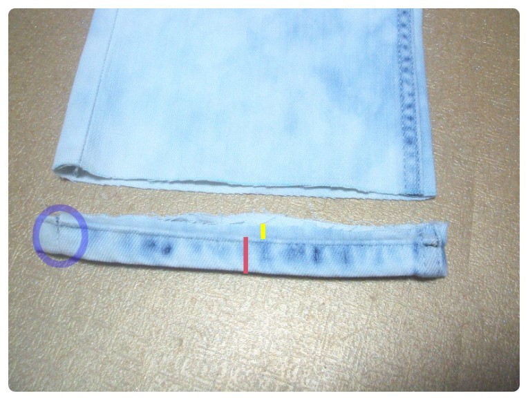 바지 밑단은 빨간 부분과 노란 부분의 길이가 같도록 여유를 두고 잘라줍니다.