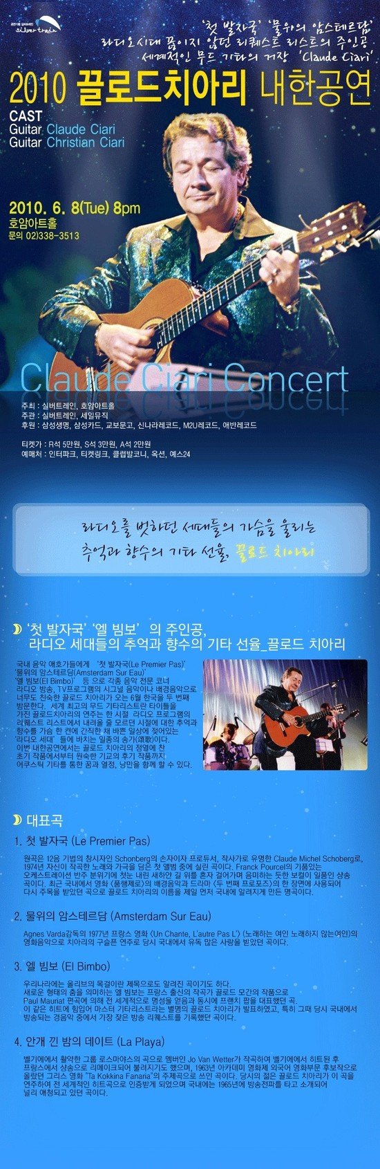 프랑스출신 기타리스트 끌로드 치아리는 일렉트릭 기타의 압도적인 음을 저버리고 순수 기타 의 원천에 도달한, 전 세계에 몇 안되는 클래식 기타리스트의 거목으로 오랫동안 기억되고있다. 마치 생명을 지닌 듯 오묘한 감정에 오열하는 기타의 음색, 악상을 다지며 차분히 흐르는 그 가락. 아마도 모든 악기 중에서 기타만큼 무드음악에 적합한 악기도 없겠지만 오늘날 활약하고 있는 기타리스트 중에서 아직도 끌로드 치아리에 필적할만한 아티스트가 나타나지 않고 있다는 점만으로도 그의 존재 가치를 다시 한번 확인하게 해준다.