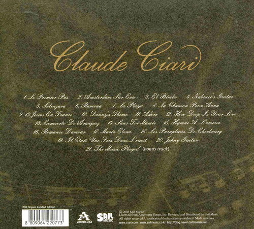 국내영화로는 '품행제로'와 드라마 '두 번째 프로포즈'의 오리지널 사운드 트랙으로 사용되었던 '첫 발자욱'과 드라마 '겨울 연가'의 유진과 준상의 테마곡 '하얀 연인들', '안개낀 밤의 데이트' 등 올드 팝 팬들의 영원한 리퀘스트 송으로 '끌로드 치아리 (Claude Ciari)'의 앨범 'Claude Ciari Best Collection' 21곡 훌 타임입니다.