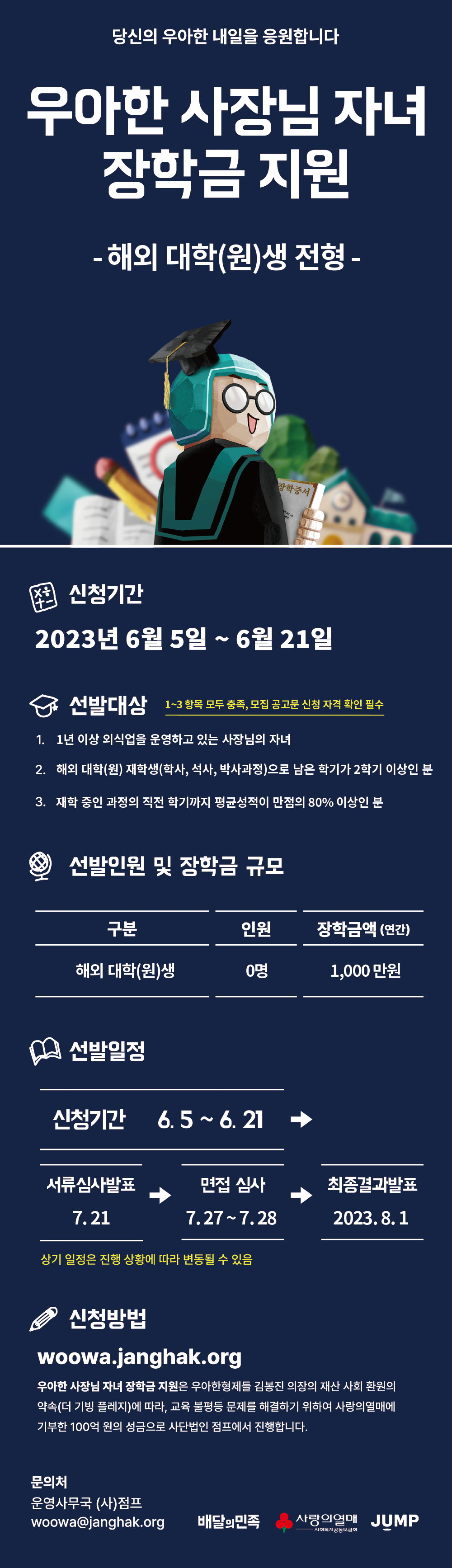 「우아한 사장님 자녀 장학금 지원」에서 해외에서 유학 중인 외식업주 사장님의 자녀가 교육비의 부담과 어려움을 겪지 않고 학업에 대한 꿈과 열망을 이어나갈 수 있도록 해외유학생 자녀의 장학금을 지원합니다!