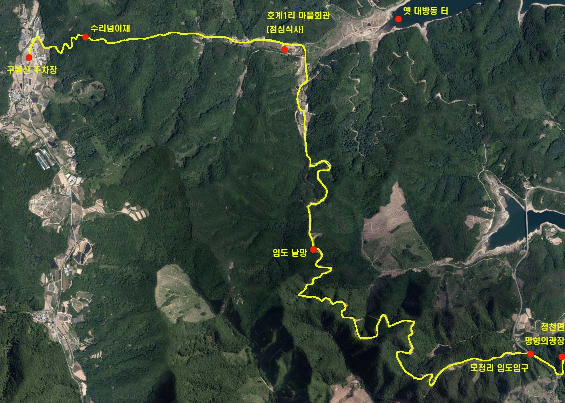 09:00 - 09:20 집결 및 차량이동. 구봉산 주차장 -> 정천면 망향의광장 12㎞