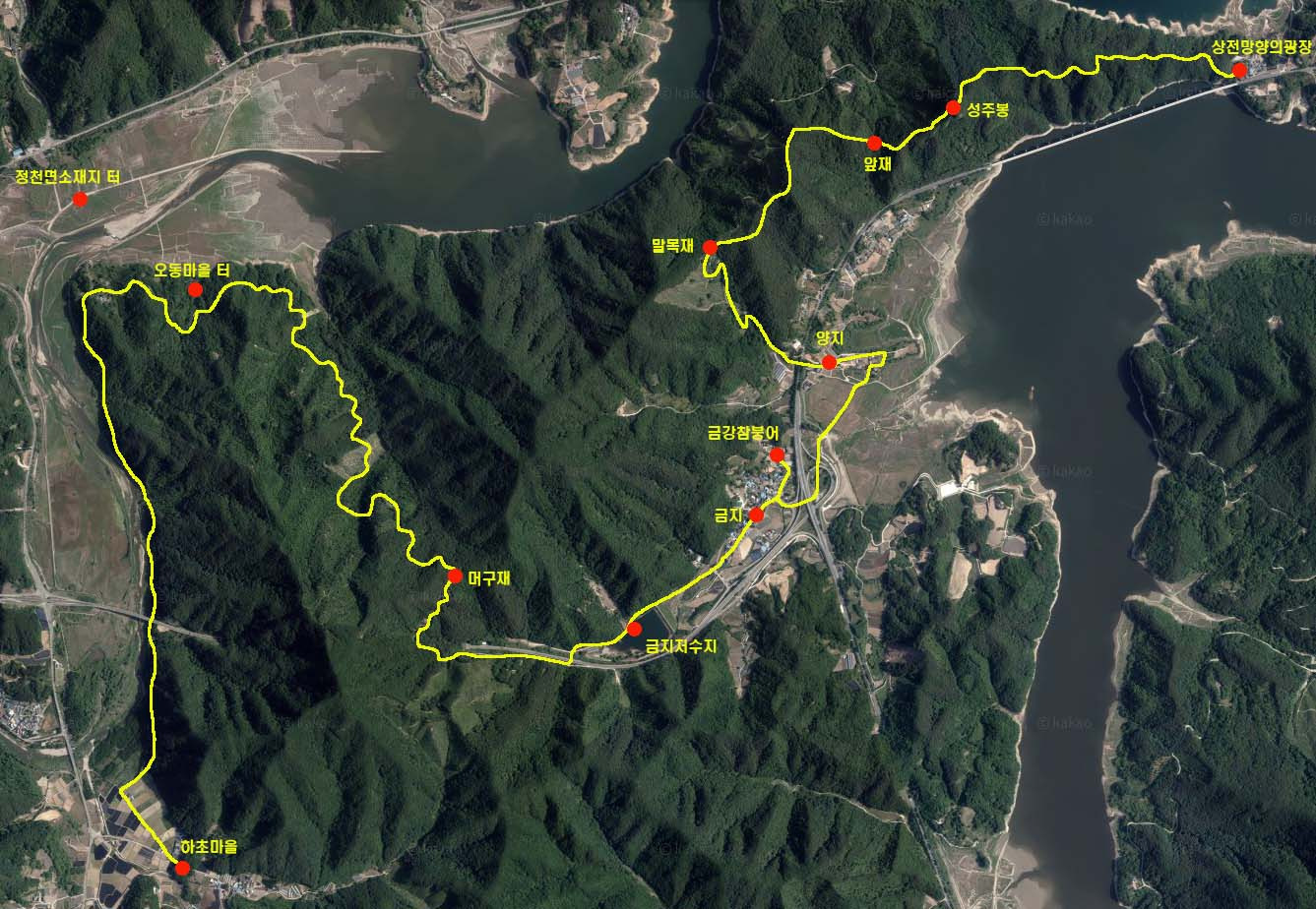 09:30 - 15:00 걷기. 망향의광장 ~ 성주봉 ~ 말목재 ~ 양지 ~ 금지 ~ 금지저수지 ~ 머구재 ~ 임도 ~ 하초 15.2㎞