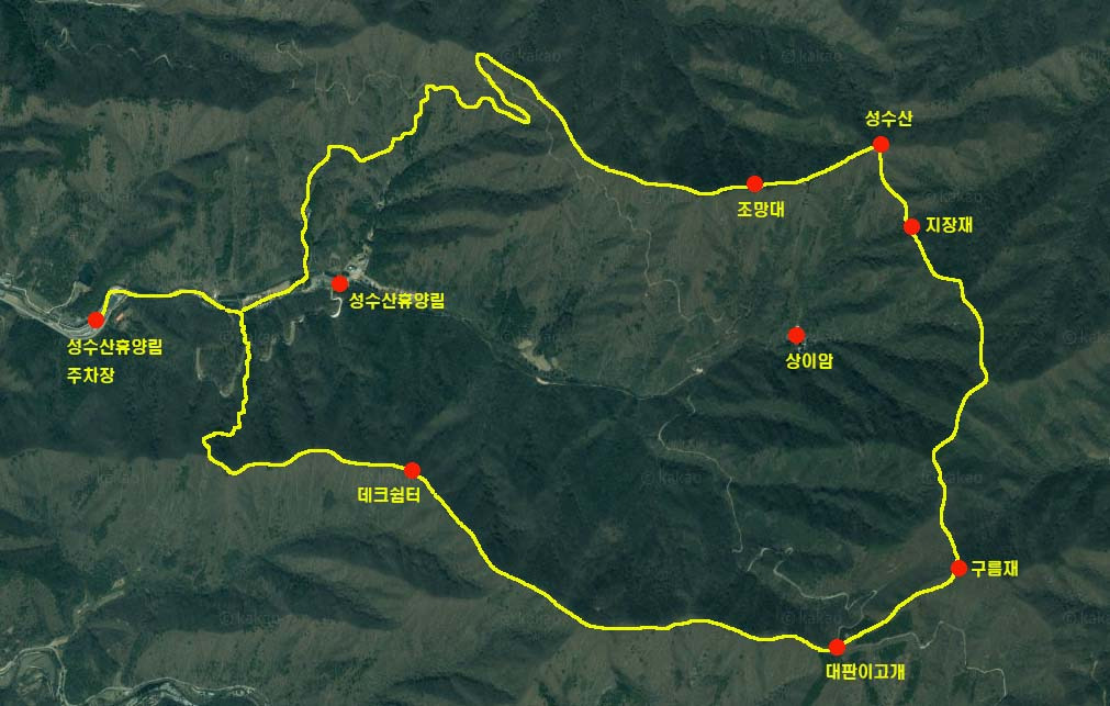 09:00 - 15:00 걷기. 주차장 ~ 휴양림 ~ 꼬부랑재 ~ 임도 ~ 조망대 ~ 성수산 ~ 지장재 ~ 구름재 ~