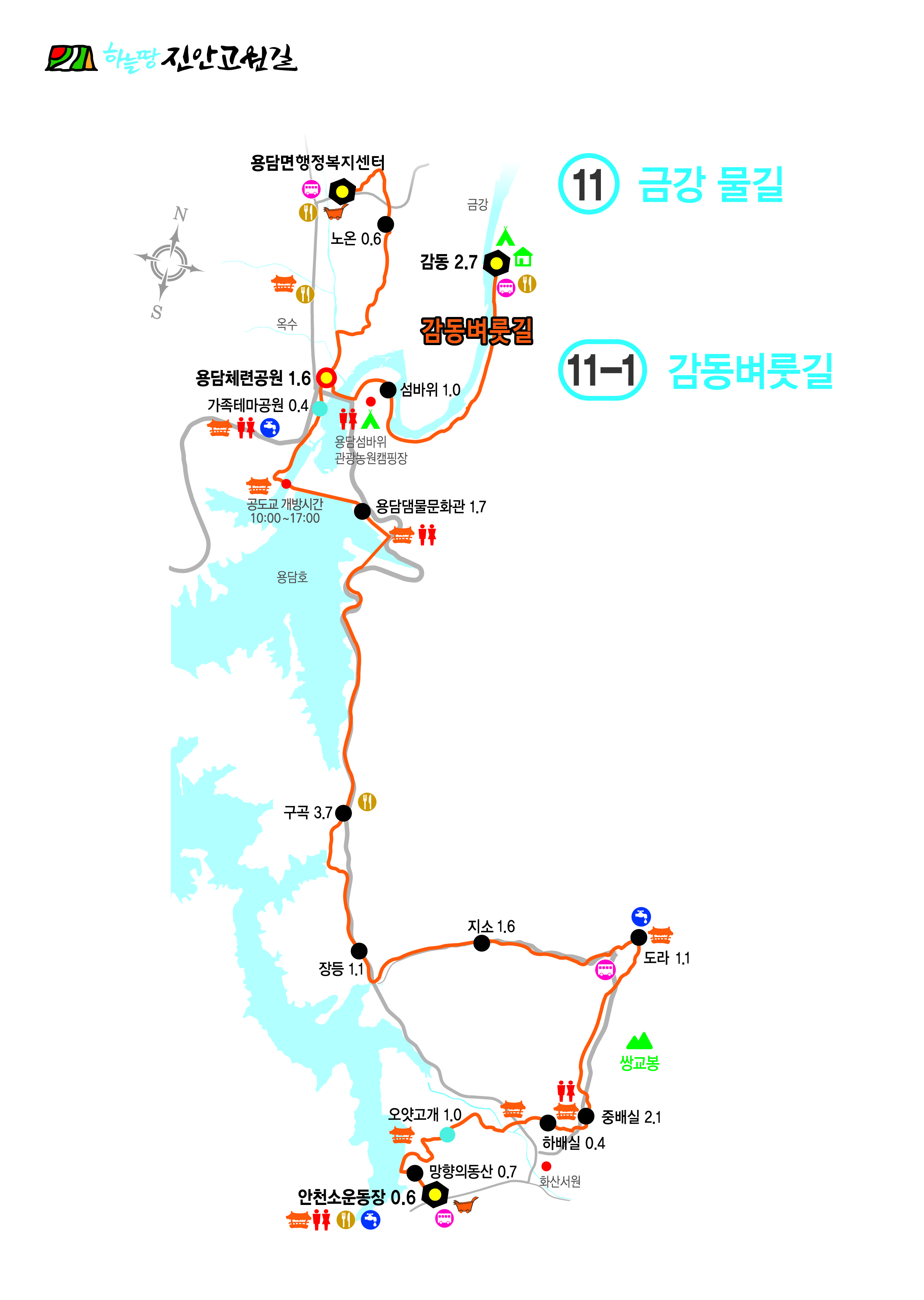 | 10:10 - 12:20 | 걷기 | 중배실 - 용담댐공원 (8.5) | ||