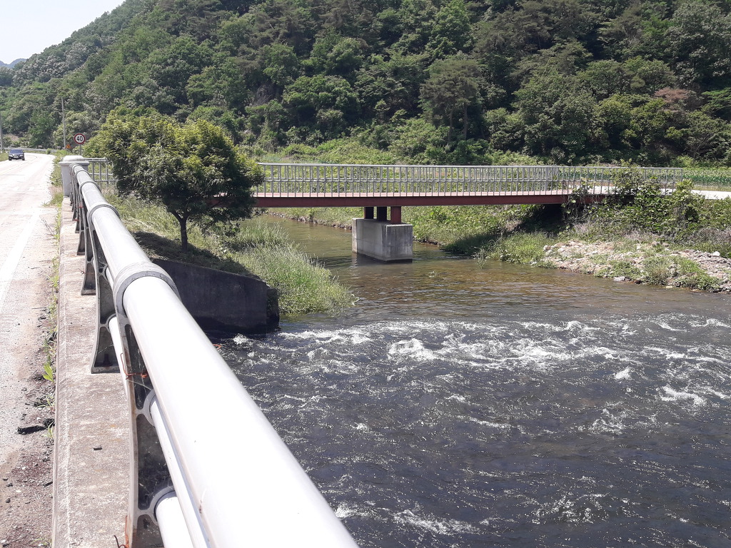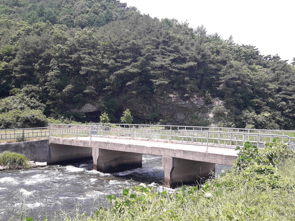 민하마을로 진입하기 직전, 다리를 건너면서 드디어 봇도랑 하나를 발견합니다. 꽤 괜찮은 절벽을 치며 돌아 흐르는 물길인데 절벽이 끝나는 곳 어름에 수구가 보였습니다. 워낙 흔하고 강한 물길인지라 봇도랑을 철철 넘치며 흘러들어가고, 그러고도 남는 물은 강에 되쏟아부으면서 마을 안으로 흐릅니다.