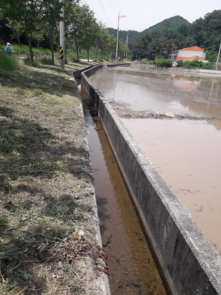 마침 「문화공간 창」 건너편의 논에 물이 그득히 대어져 있습니다. 큰길에서 내려서서 논에 어떻게 물을 댔는지 보았습니다. 이런! 작은 수로가 나 있었습니다!