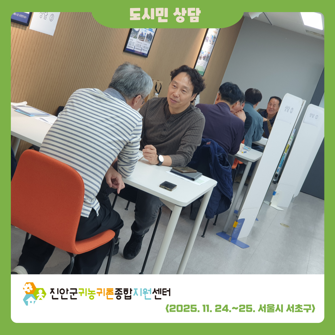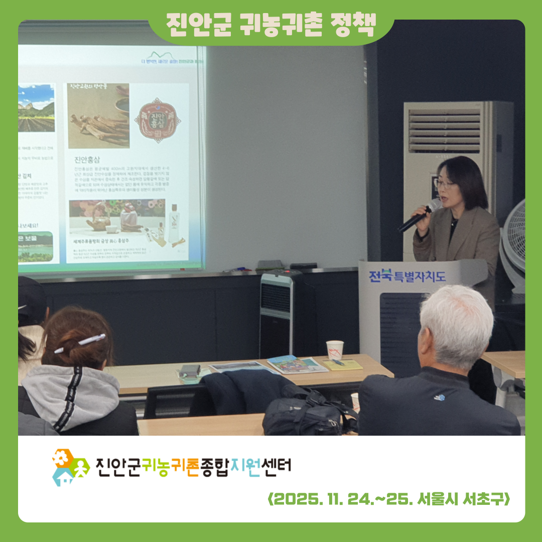 진안군은 서울·수도권 도시민을 대상으로 한 「도시민 상담 홍보 교육」을 11월 24일부터 25일까지 이틀간 서울시 서초구에서 운영했습니다. 본 교육은 진안군의 귀농·귀촌 여건과 정책을 보다 정확하게 알리고, 예비 귀농·귀촌인들의 이해를 돕기 위해 마련되었습니다.