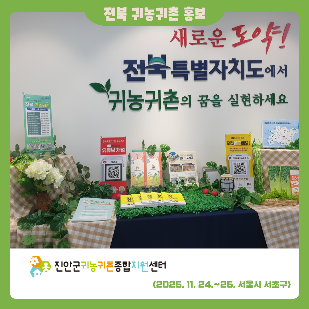 특히 현장 상담과 질의응답 시간을 통해 참가자들은 자신의 관심 분야와 여건에 맞는 귀농·귀촌 정보를 구체적으로 확인할 수 있었으며, 진안군이 지닌 자연환경과 정책적 강점에 대한 이해를 높이는 계기가 되었습니다.