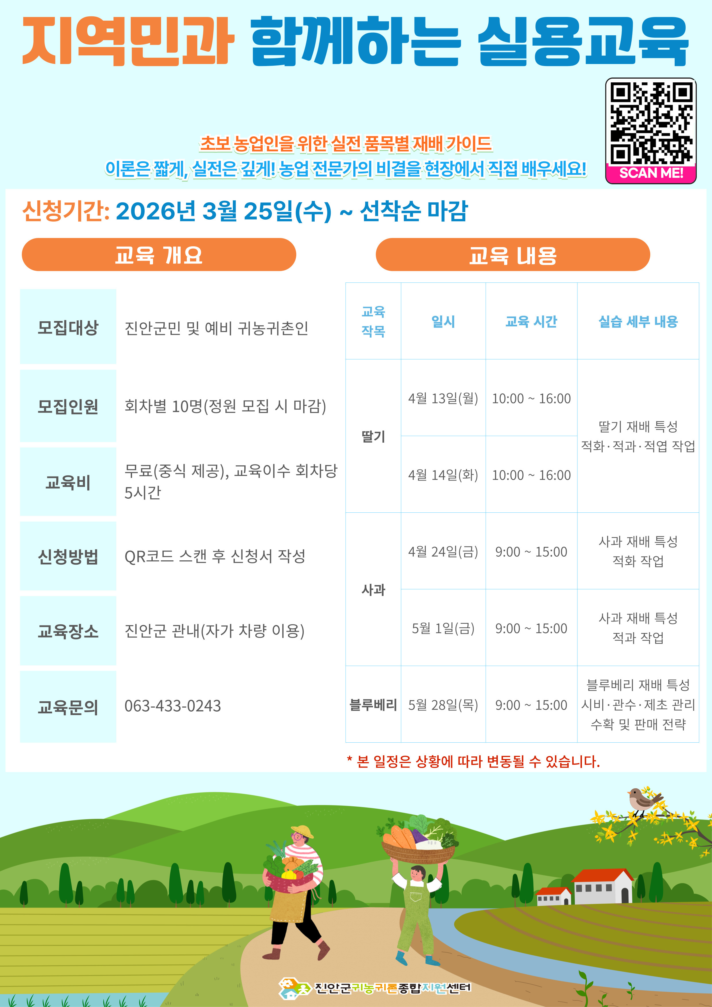 [모집] 지역민과 함께하는 실용교육_초보 농업인을 위한 품목별 재배 교육 작성자사무국(원종화)|작성시간26.03.25|조회수63 목록 댓글 0 글자크기 작게가 글자크기 크게가 ▲▲▲신청서 작성▲▲▲ - 모집인원: 회차별 10명(정원 모집 시 마감) - 모집대상: 진안군민 및 예비 귀농귀촌인 - 모집기간: 2026년 3월 25일 ~ 선착순 마감 - 교육기간: 2026년 4월 13일 ~ 5월 28일(총 5회) - 교 육 비: 무료 - 교육장소: 진안군 관내(자가 차량 이용으로 농장 방문) - 신청방법: 네이버폼 문의☎ 진안군 귀농귀촌종합지원센터 (063-433-0243) 다음검색 현재 게시글 추가 기능 열기 북마크 공유하기 신고 센터로 신고 댓글 댓글 0 댓글쓰기 답글쓰기 댓글 리스트