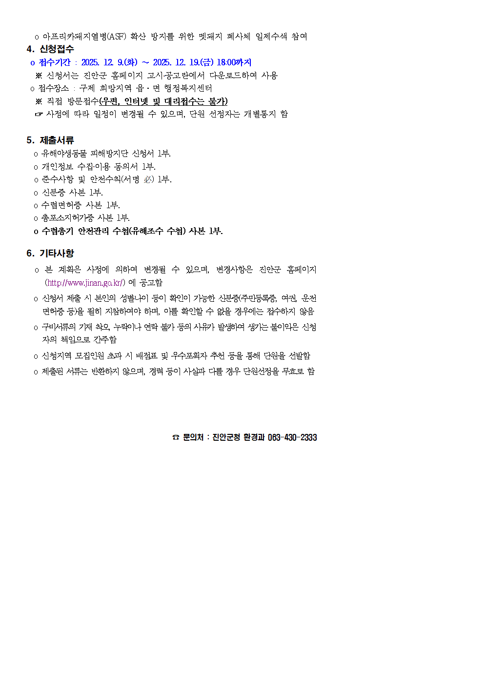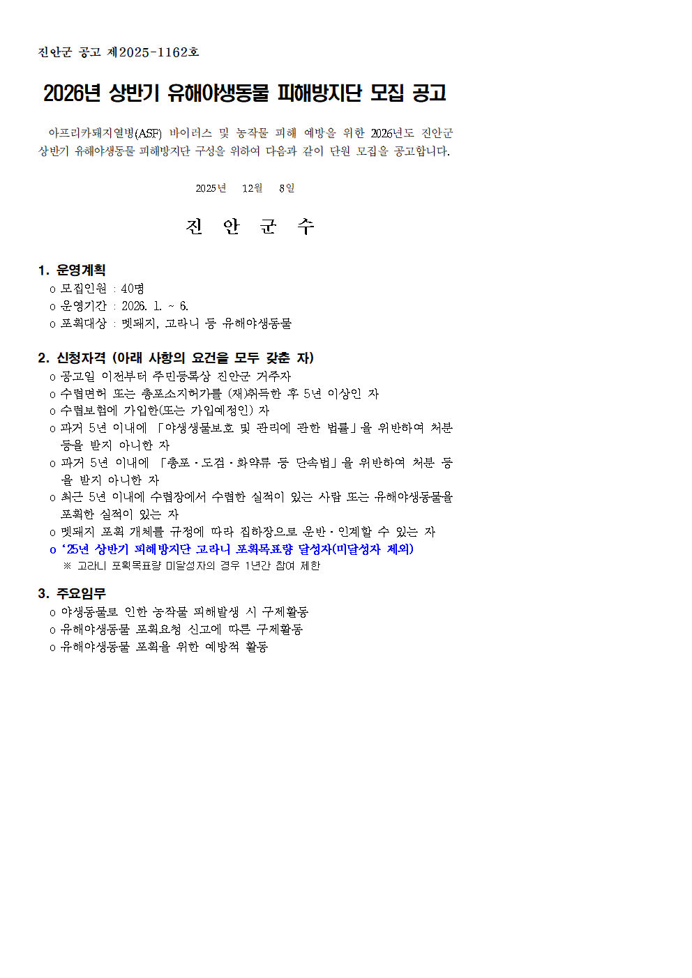 2026년 상반기 유해야생동물 피해방지단 모집 작성자사무국(문수현)|작성시간25.12.10|조회수16 목록 댓글 0 글자크기 작게가 글자크기 크게가 2026년 상반기 유해야생동물 피해방지단 모집 공고문.hwp70.00KB 첨부파일첨부된 파일이 3개 있습니다. gif 파일 2026년 상반기 유해야생동물 피해방지단 모집 공고문001.gif 다운로드 gif 파일 2026년 상반기 유해야생동물 피해방지단 모집 공고문001.gif 다운로드 hwp 파일 2026년 상반기 유해야생동물 피해방지단 모집 공고문.hwp 다운로드 다음검색 현재 게시글 추가 기능 열기 북마크 공유하기 신고 센터로 신고 댓글 댓글 0 댓글쓰기 답글쓰기 댓글 리스트