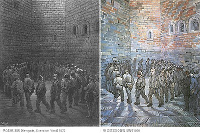반 고흐의 한 평전 제목처럼 그는 ‘세상의 모든 것을 사랑한 화가’였다. “신을 알 수 있는 가장 좋은 방법은 많이 사랑하는 것이다”라고 스스로 말했을 만큼 그는 사랑할 수밖에 없는 ‘존재’들, ‘우리에게 마치 의무처럼 부과된 사랑’을 향해 무한히 열려 있었다. 하지만 그런 무한함이야말로 반 고흐에게 가장 견디기 어려운 부담이 되었던 것은 아닐까? 수없이 반복된 연애의 실패, 아를르에서의 계획 포기, 그리고는 인간 존재에 대한 모종의 회의감이 그를 압도했는지도 모른다. 반 고흐는 생-레미 정신병원에서 영국의 판화가 구스타브 도레 (Gustave Dore)의 작품 [Newgate, Exercise Yard](1872)를 번안한 [죄수들의 보행]을 그리면서 더 이상 예전처럼 개별 인간 존재의 초상을 즐겨 그릴 수 없게 되었다. 그 해 1890년, 인적이 드문, 까마귀들만이 가득한 벌판의 풍경을 바라보며 권총 자살을 하기까지……. | |