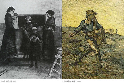 우리에겐 [감자를 먹는 사람들](1885) 정도만이 그의 초기작 중 흔히 알려져 있지만, 이외에도 그는 수많은 농부, 직공, 가난하고 평범한 사람들의 초상을 그렸다. 거의 독학에 가까운 그의 초기작업에 많은 영감을 제공했던 것은, 19세기 중엽 영국의 사회적 리얼리즘(Social Realism) 작가들이 제작한 석판화들이었는데(반 고흐는 이 석판화들을 열성적으로 수집했고 그 중 약 1500점이 현재 반 고흐 미술관에 보관되어 있다), 반 고흐는 [수프 배급소](1883)와 같은 그의 초기 판화작품에서 가난한 이들이 식사를 준비하는 행위 자체에도 엄숙한 종교적 신성함이 깃들여져 있음을 포착하고자 했다. 또한 밀레와 마찬가지로 농부들을 즐겨 그렸고, [씨뿌리는 사람](1888)에서 볼 수 있는 것 처럼 건강한 에너지로 자연과 호응하는 농부에서부터, [정오의 휴식]과 같이 노동을 잠시 멈추고 달콤한 휴식을 취하는 행복한 시골부부, [붉은 포도밭]에서 나타나듯이 풍경과 완전히 합일하여 하나로 녹아 든 농부 군상에 이르기까지 노동과 삶의 국면을 성실하게 살아가는 이들의 모습을 그림으로 담았다. “더 우월적 가치를 부여할 수 있는 사람들이 어떤 사람들이냐 하면… 살아가는 내내 노력과 일의 흔적을 안고 살아가는 이들이다” 라고 반 고흐는 썼다. | |