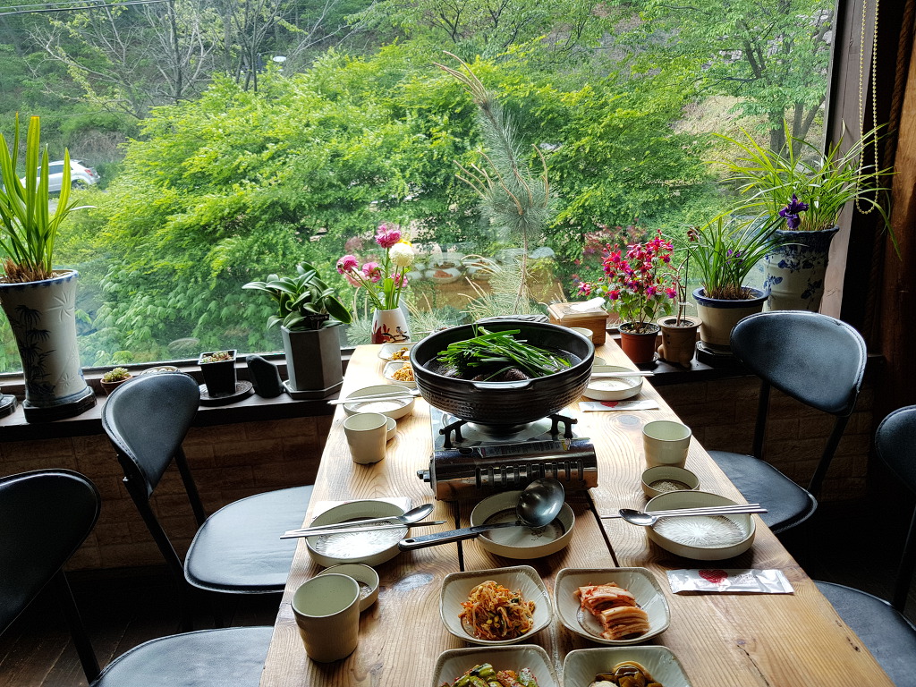메뉴로는 한방백숙(장닭, 토종닭, 오골계, 오리), 매운탕(빠가사리, 잡고기, 메기, 쏘가리, 참께, 민물새우), 오리불고기, 청국장, 묵밥, 돈까스가 있고 서브 메뉴로 도토리묵무침&해물파전이 있으며 계절메뉴와 단체손님 주문음식도 가능하다.