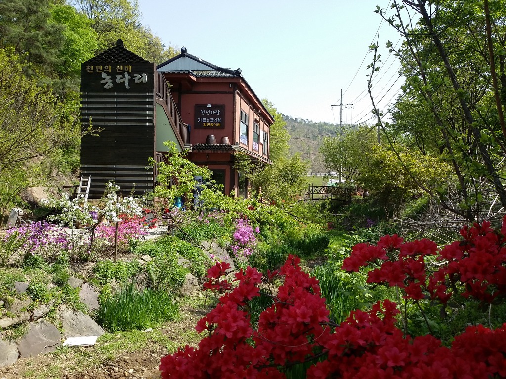 농다리천년사랑은 주변 자연과 잘 어우러져 있고 실내 분위기 또한 자연속의 카페처럼 느껴져 힐링하며 식사를 할 수 있는 진천군의 대표적 음식 명소로 유명세를 타고 있다.