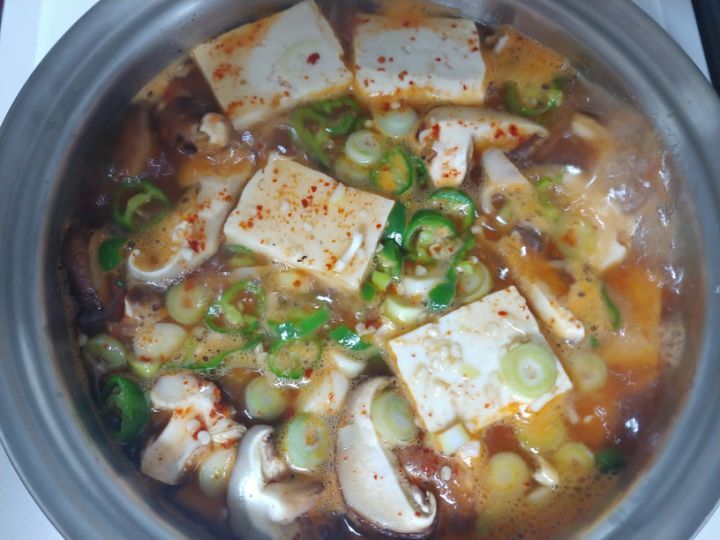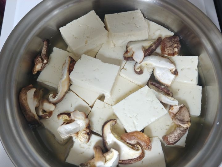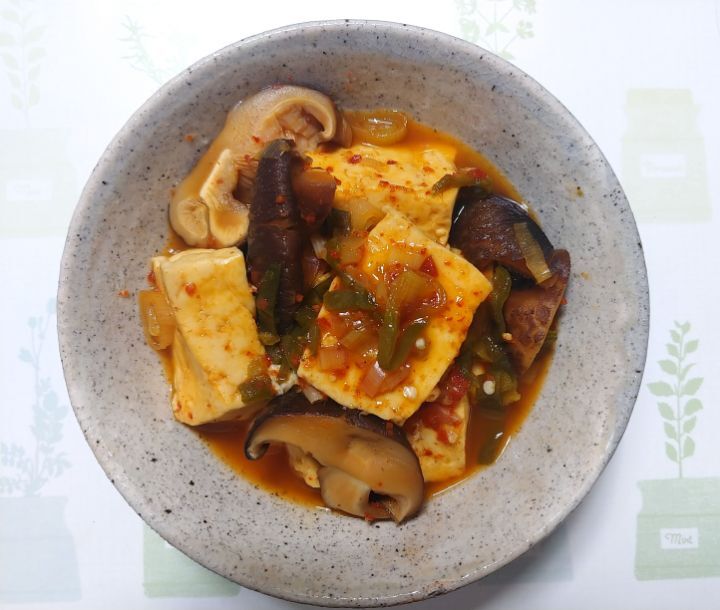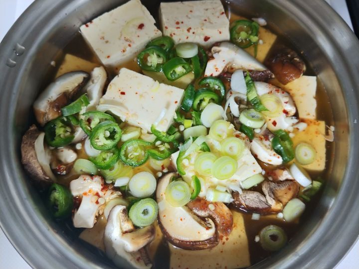 2. 마침 집에 있는 두부와 표고버섯에 펄펄 끓인 채수 육수 듬뿍 붓고 대파, 칼칼하게 청양고추 송송 썰어 얹어준다. 고춧가루를 비롯, 갖은 양념 만들어 끼얹어 준 후 끓으면 중불에 졸인다. 단짠매콤 밥도둑 두부조림 완성‥이제 먹는 일만 남았다.