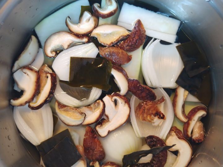 무ㆍ양파는 적당한 크기로 썰고 다시마ㆍ버섯은 양껏 넣어 푸욱~ 고았다.