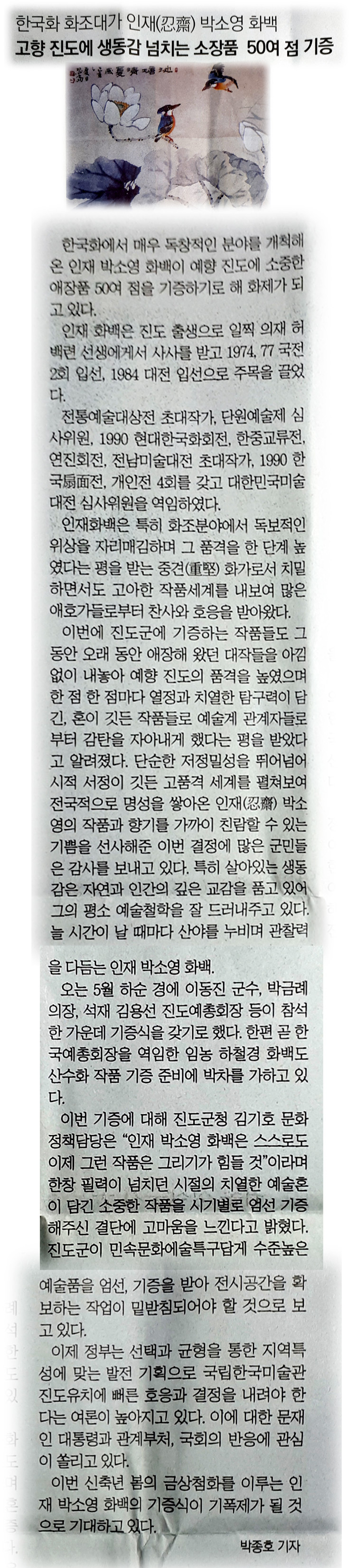 60년간 화조화 작품 활동에 주력하여 한국 화단, 화조화의 거봉으로 우뚝솟았으니, 스승 의재 선생님은 제자 인재