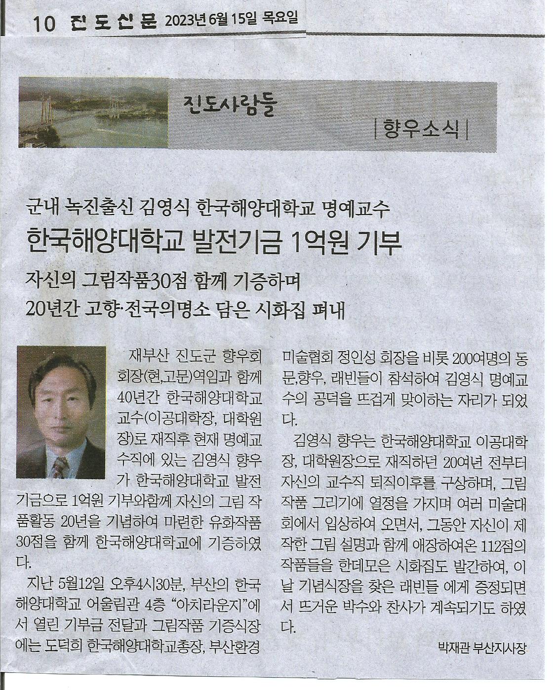 재부산 진도군 향우회 회장(현 고문) 역임과 함께 40년간 한국해양대학교 교수(이공대학장, 대학원장)로 재직후 현재 명예교수직에 있는 김영식 향우가 한국해양대학교 발전기금으로 1억원 기부와 함께 자신의 그림 작품 활동 20년을 기념하여 마련한 유화작품 30점을 함께 한국해양대학교에 기증하였다.