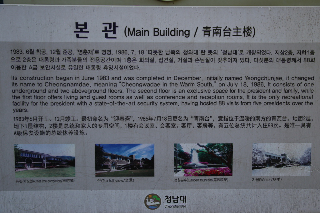 청남대는 지난 20년간 여섯 분의 대통령께서 휴식과 함께 국정을 구상하시던 곳으로 역사의 숨결이 살아 숨 쉬는 국내 유일의 대통령별장이다.