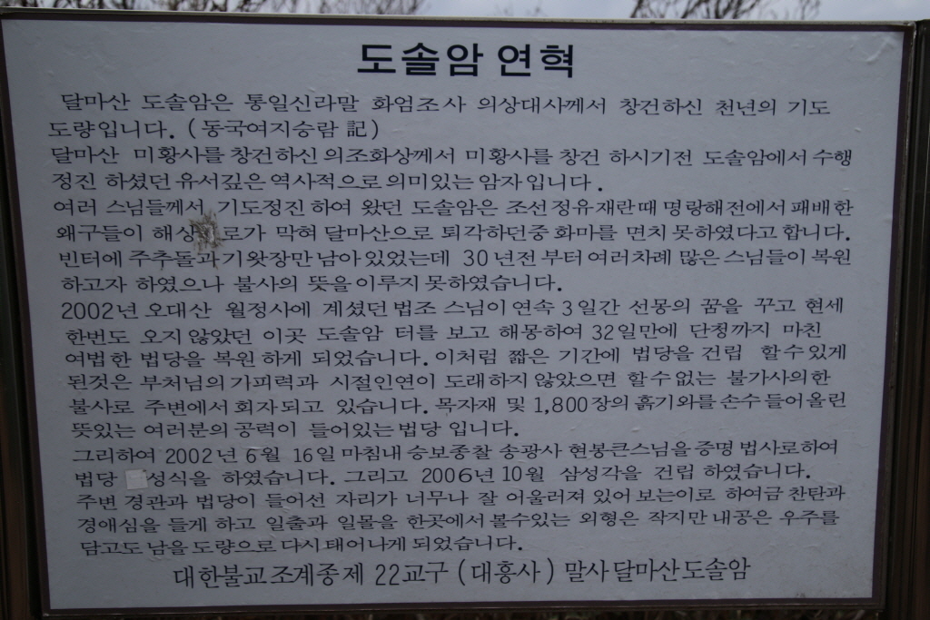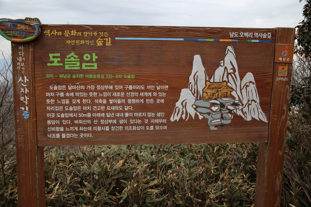 도솔봉 도솔암은 통일 신라말 의상대사께서 달마산 미황사를 창건하기 전 수행 정진하셨던 유서 깊은 곳이었지만 정유재란 때 왜구들에 의해 파괴되어 폐사지로 있었다.