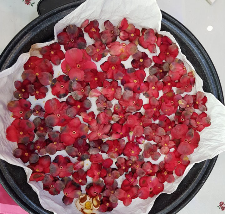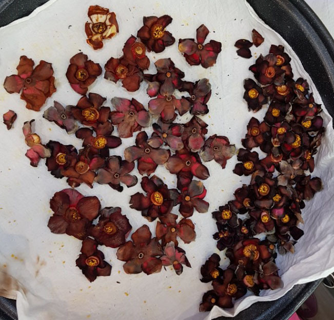 통꽃 저온 38-40 도 예열하여 한지(면포)를 깔고 꽃을 퍼서 거꾸로 엎어두었다 뒤집기를 반복