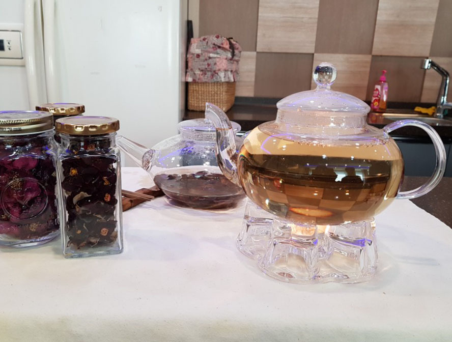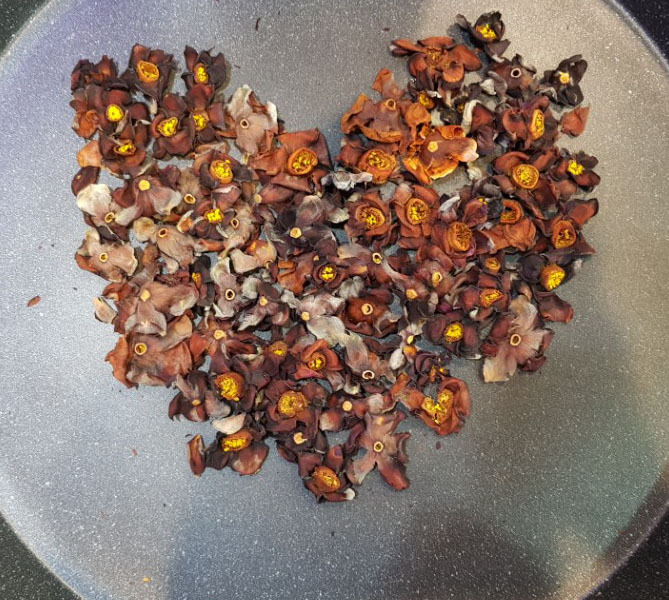 통꽃- 한지를 깔고 꽃가루를 털고 (일부 꽃술을 자른다) 덖음솥에 올려 놓는다