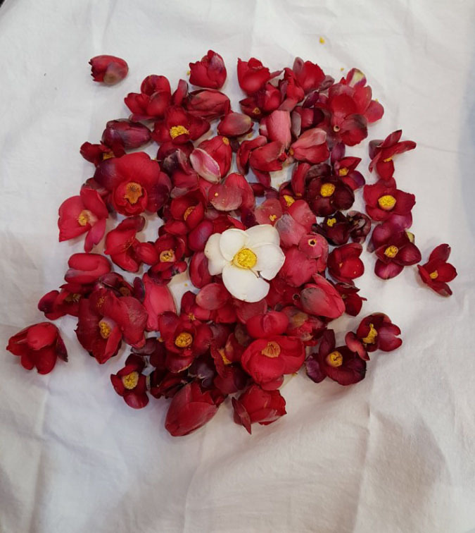 꽃잎 -체온 온도에서 한지를 깔고 꽃잎을 한 장씩 떼어 덖음솥에 올려놓는다