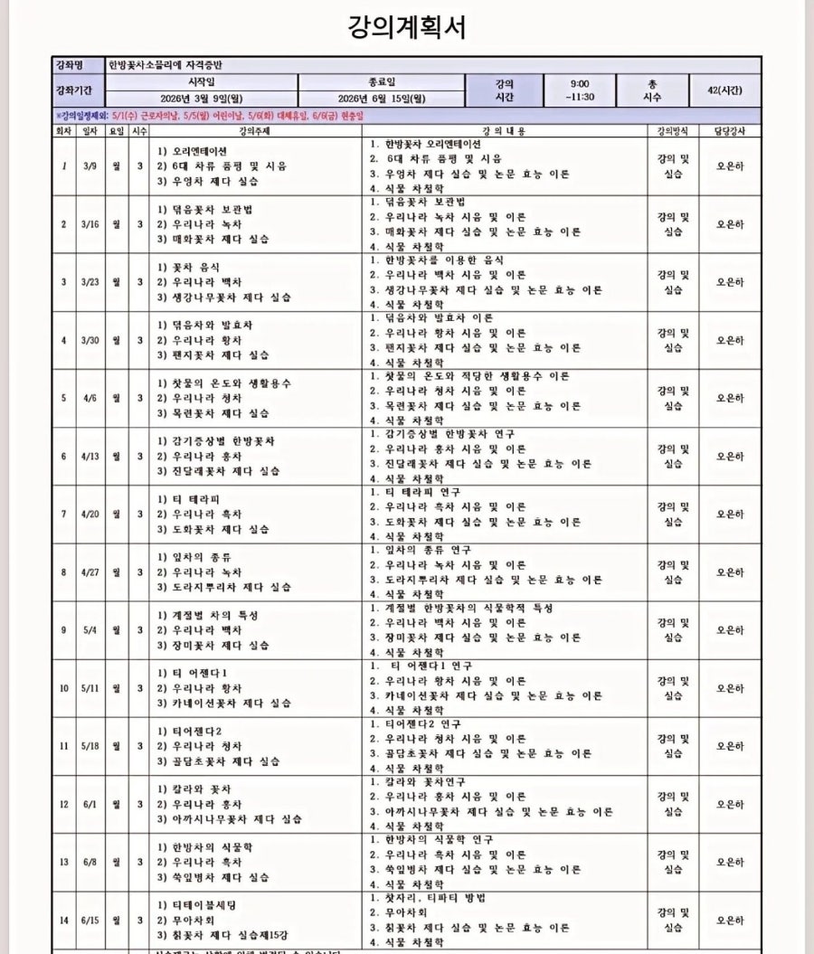 수 13:00–16:00 │ 한방꽃차소믈리에