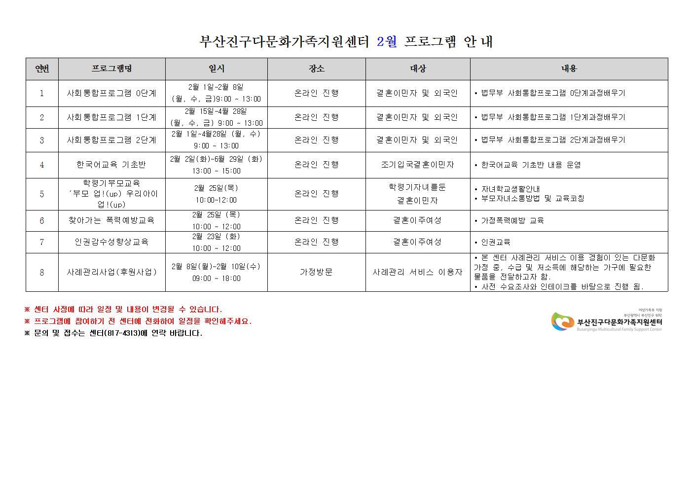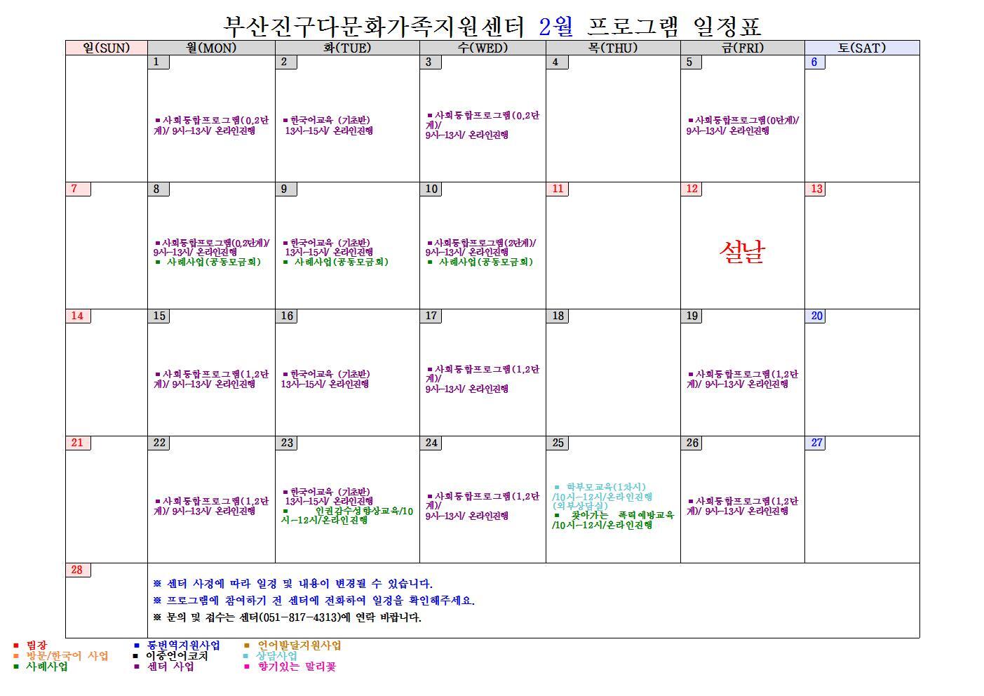 2월 프로그램 일정표 및 안내 작성자진구다문화센터|작성시간21.01.29|조회수20 목록 댓글 0 글자크기 작게가 글자크기 크게가 다음검색 현재 게시글 추가 기능 열기 북마크 공유하기 신고 센터로 신고 댓글 댓글 0 댓글쓰기 답글쓰기 댓글 리스트