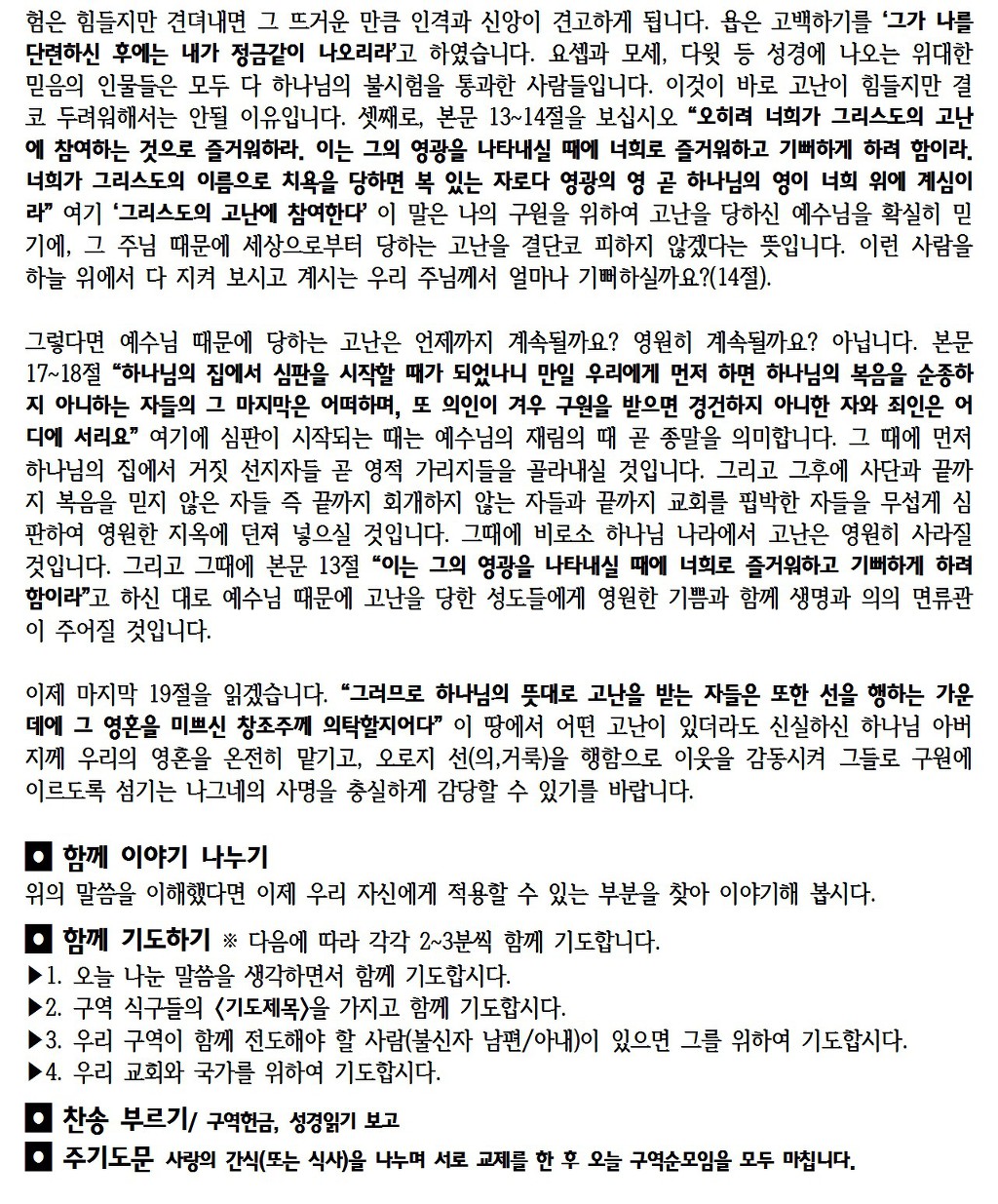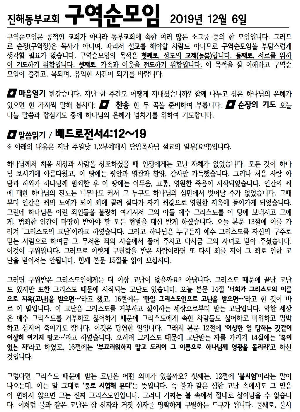 2019-12-06 진해동부교회 구역순모임 교재 작성자金基海|작성시간19.12.03|조회수187 목록 댓글 0 글자크기 작게가 글자크기 크게가 2019-12-06 그리스도인이기에 받는 고난.hwp 첨부파일첨부된 파일이 3개 있습니다. jpg 파일 2019-12-06a.jpg 다운로드 jpg 파일 2019-12-06b.jpg 다운로드 hwp 파일 2019-12-06 그리스도인이기에 받는 고난.hwp 다운로드 다음검색 현재 게시글 추가 기능 열기 북마크 공유하기 신고 센터로 신고 댓글 댓글 0 댓글쓰기 답글쓰기 댓글 리스트
