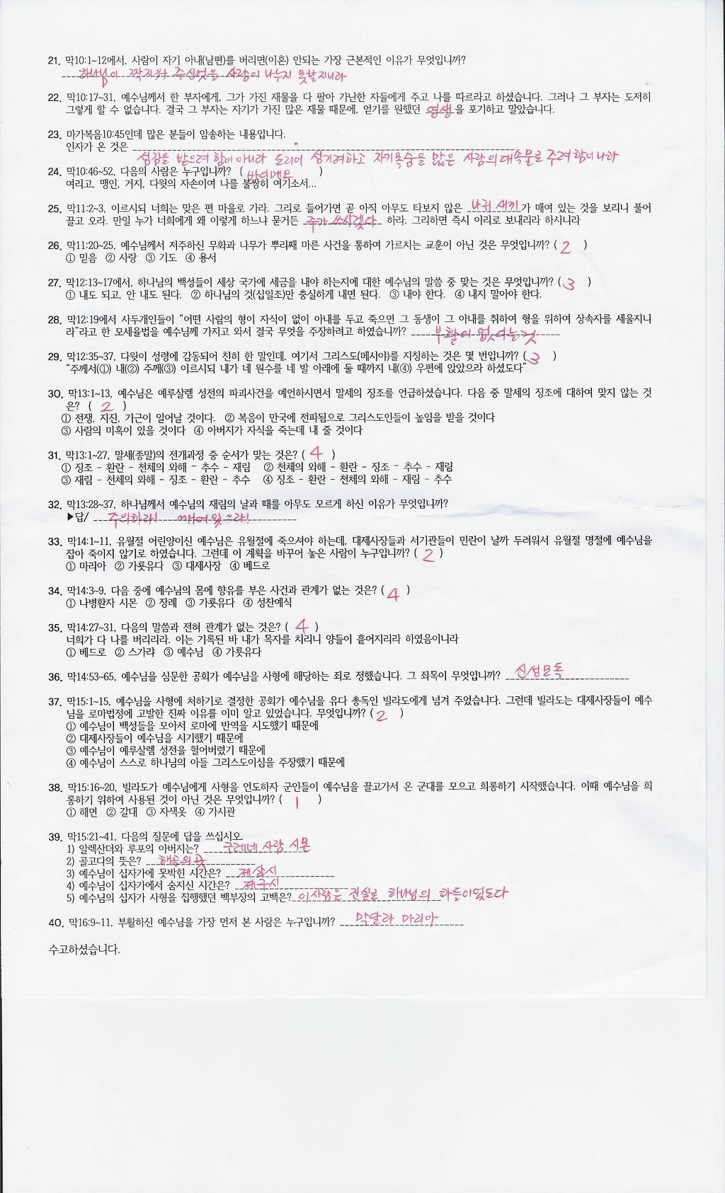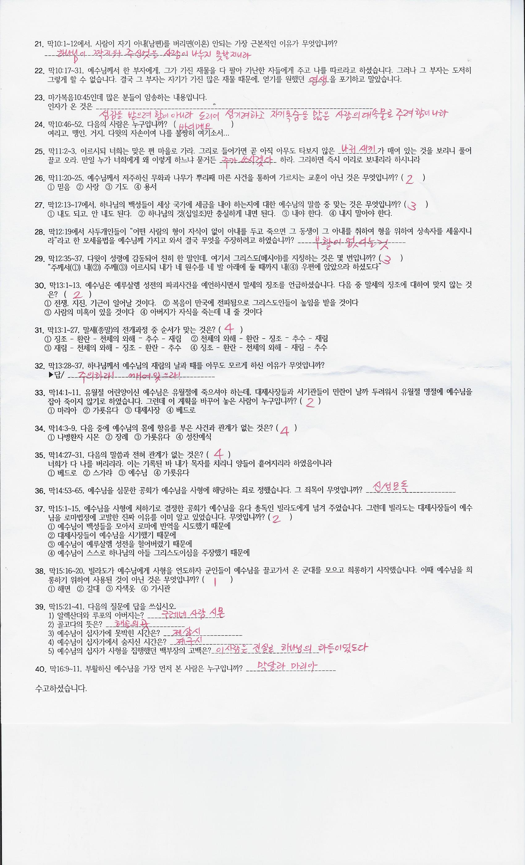 시험범위를 누가복음으로 착각하고 미리 공부를 열심히 했다가 한 주 전에 마가복음으로 알게 되어 다시 공부했다는 정@련권사님에겐 갑절로 은혜 주셨음을 믿어 의심치 않습니다. ㅎㅎ