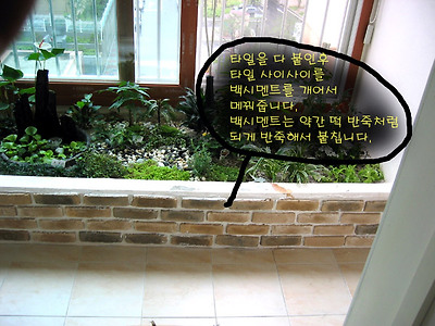 원래 벽돌타일 시공시 간격을 거의 두지않고 딱붙여 시공하지만... 전 그냥 내츄럴하게 하기위해 간격을 많이 띄웠답니다... (사실 돈이 없어서...^^;;;....타일이 모자랐거든요..ㅎㅎㅎㅎ) ![]()