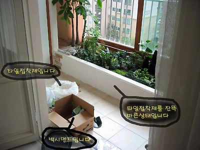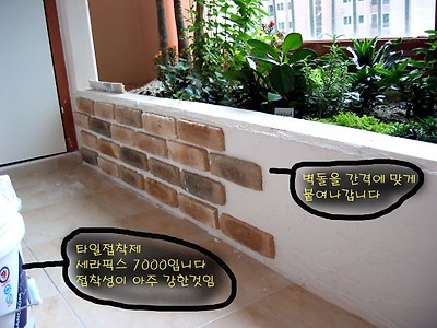 안녕하세요 레테입니다. 타일시공에 문의가 많아서 자세하진 않지만 사진찍어둔게 있더라구요...그래서 정리해서 올립니다. 침실 베란다구요...화이트 시멘트 벽이 휑해서 벽돌타일을 붙였답니다. 화단부분은 파벽돌타일 약 1회배( 2만~2만5천원)가 들었구요.. 타일접착제, 백시멘트 약 2봉지, 핸디코트 5키로짜리 샀습니다. 물론 남았구요. 타일과 타일접착제 백시멘트는 타일가게에 다 팝니다.. 맨벽을 깨끗이 닦은다음 타일접착제를 두껍게 바릅니다. 파벽돌은 무게가 나가기때문에 접착성이 강한걸로 고르셔야합니다. 일단 저는 손으로 퍽퍽 퍼다가 발랐습니다 듬뿍,,^^;; ![]()